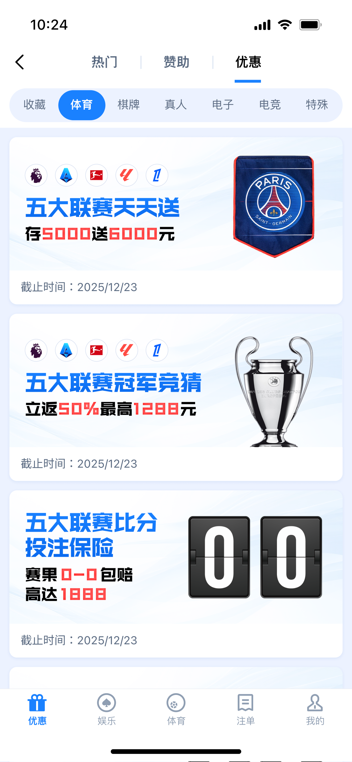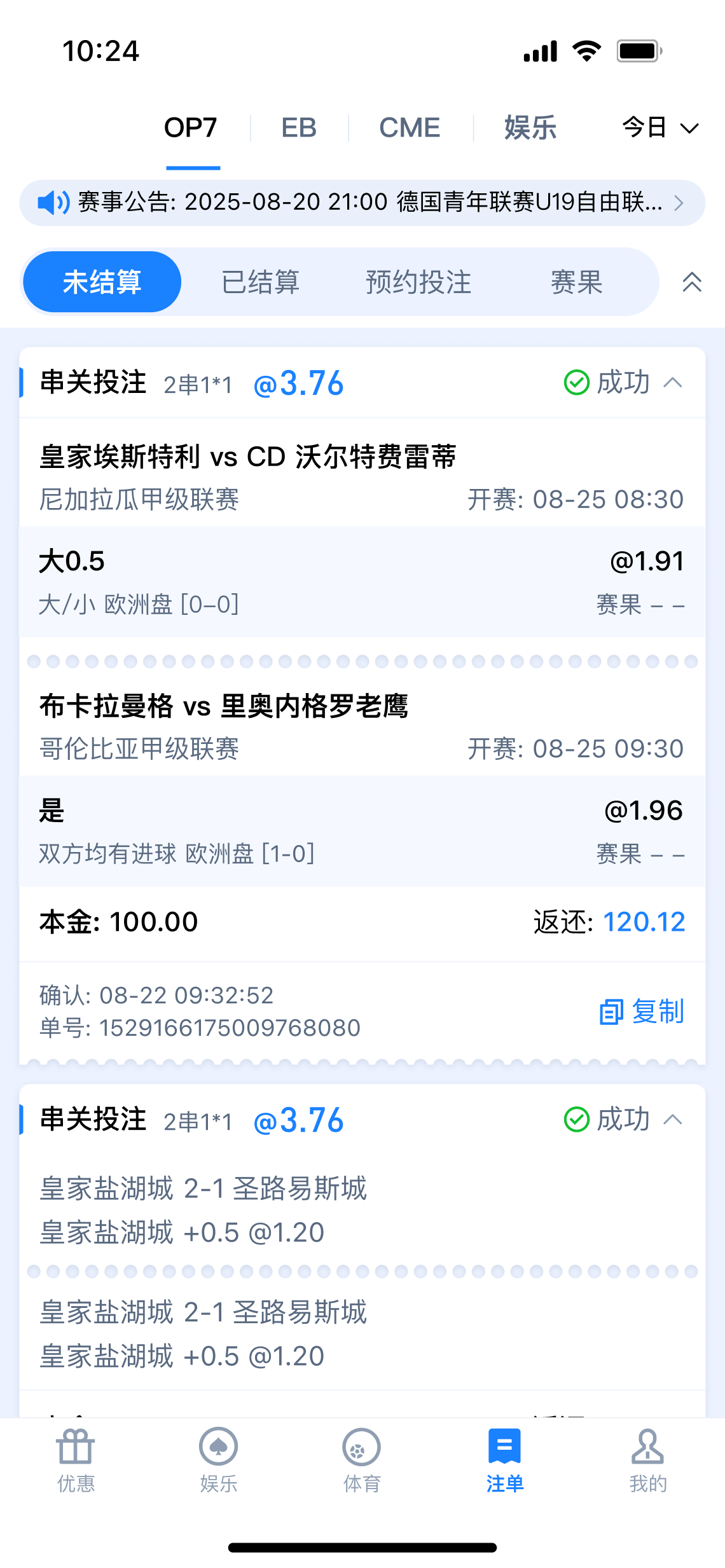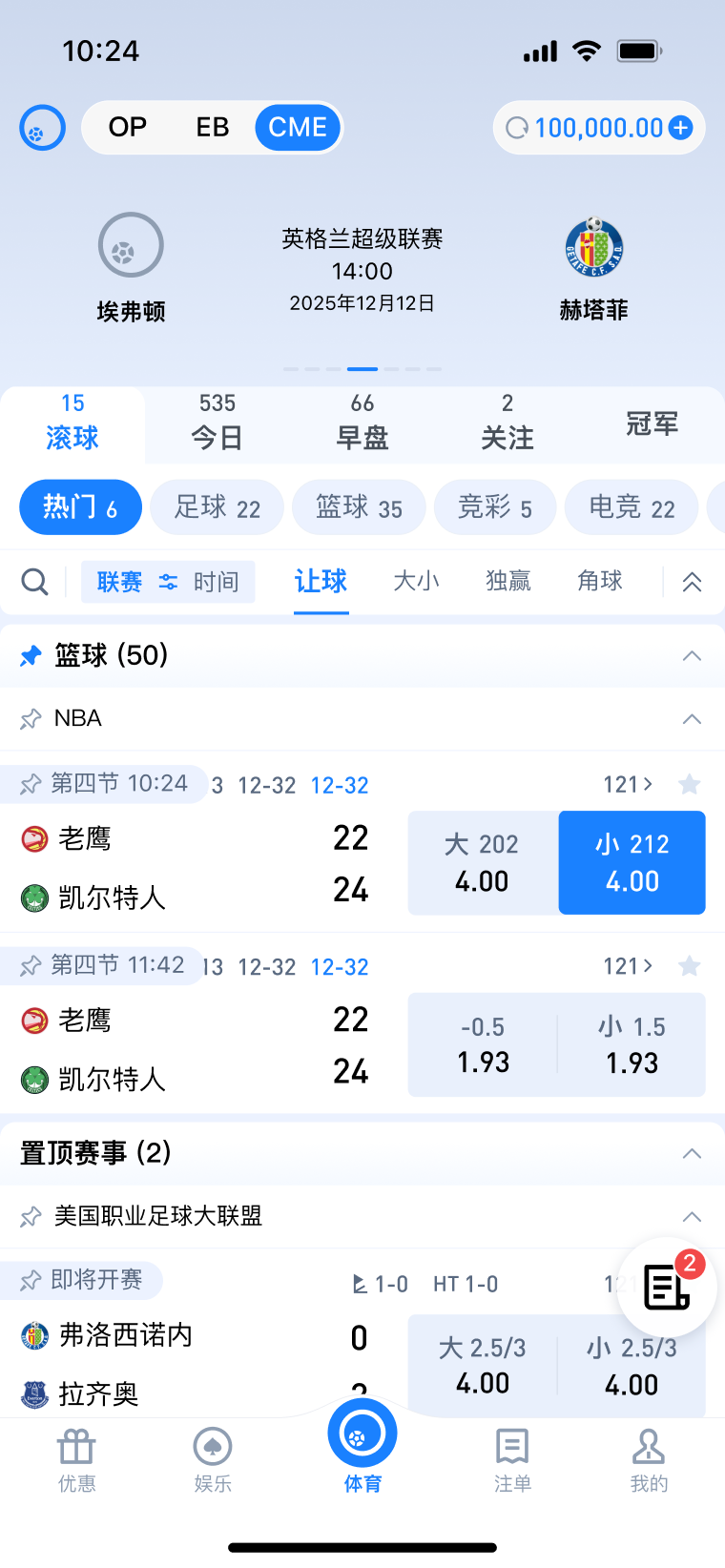 每周于【OP体育】【CME体育】【EB体育】场馆投注指定赛事,享指定场馆总负盈利包赔!本活动无需申请,赛事结束12小时后自动结算包赔彩金。详情请查看官网活动页面。
